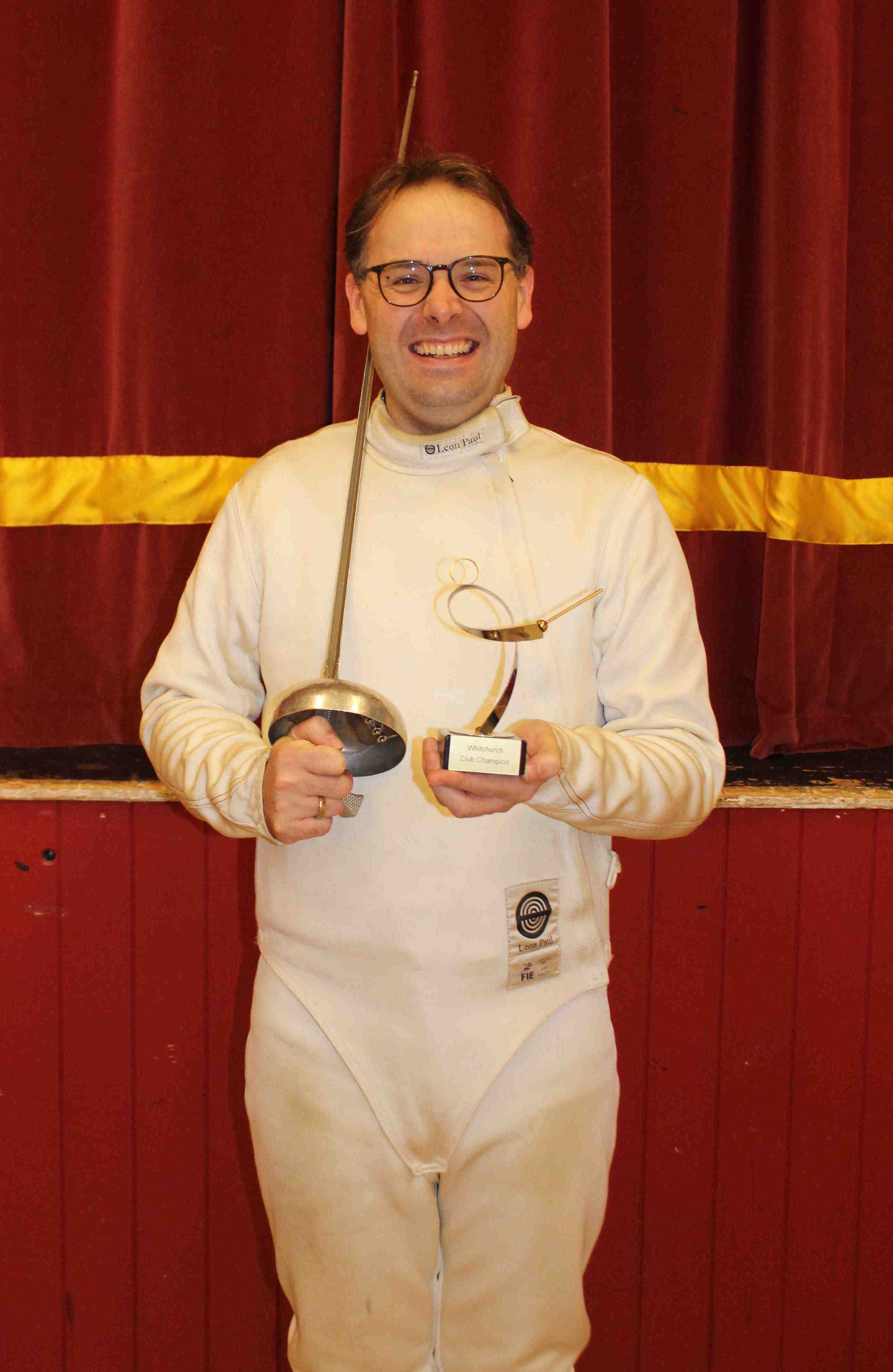 As another year comes to a close, Whitchurch Fencing Club decided to celebrate it with a `Club Champion` competition, for which a modern statuette trophy was awarded. Format Poule Unique, and the winner, seen here with the trophy, is club member Marc Walford, whose day job is as Vicar in the Merthyr Tydfil ministry area. Well done, Marc !